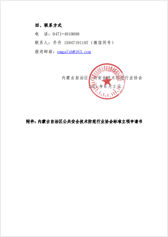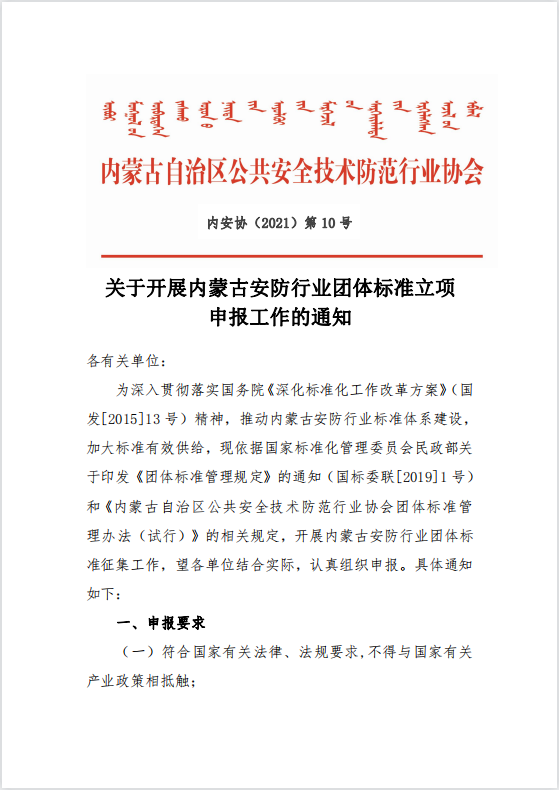 關(guān)于開展內(nèi)蒙古安防行業(yè)團體標(biāo)準(zhǔn)立項 申報工作的通知